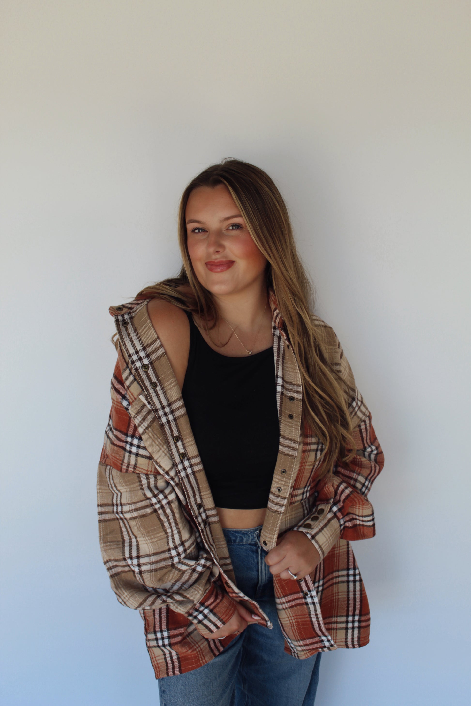 The ultimate fall layering piece- this plaid shacket combines the coziness of a flannel with the versatility of a jacket. Featuring warm shades of rust, tan, and cream, this oversized fit is perfect for tossing over a basic tee or sweater for that effortless, cozy-girl vibe. With button-up detailing and front pockets, it's both stylish and functional- your go to for pumpkin patches, bonfires, or casual coffee runs.