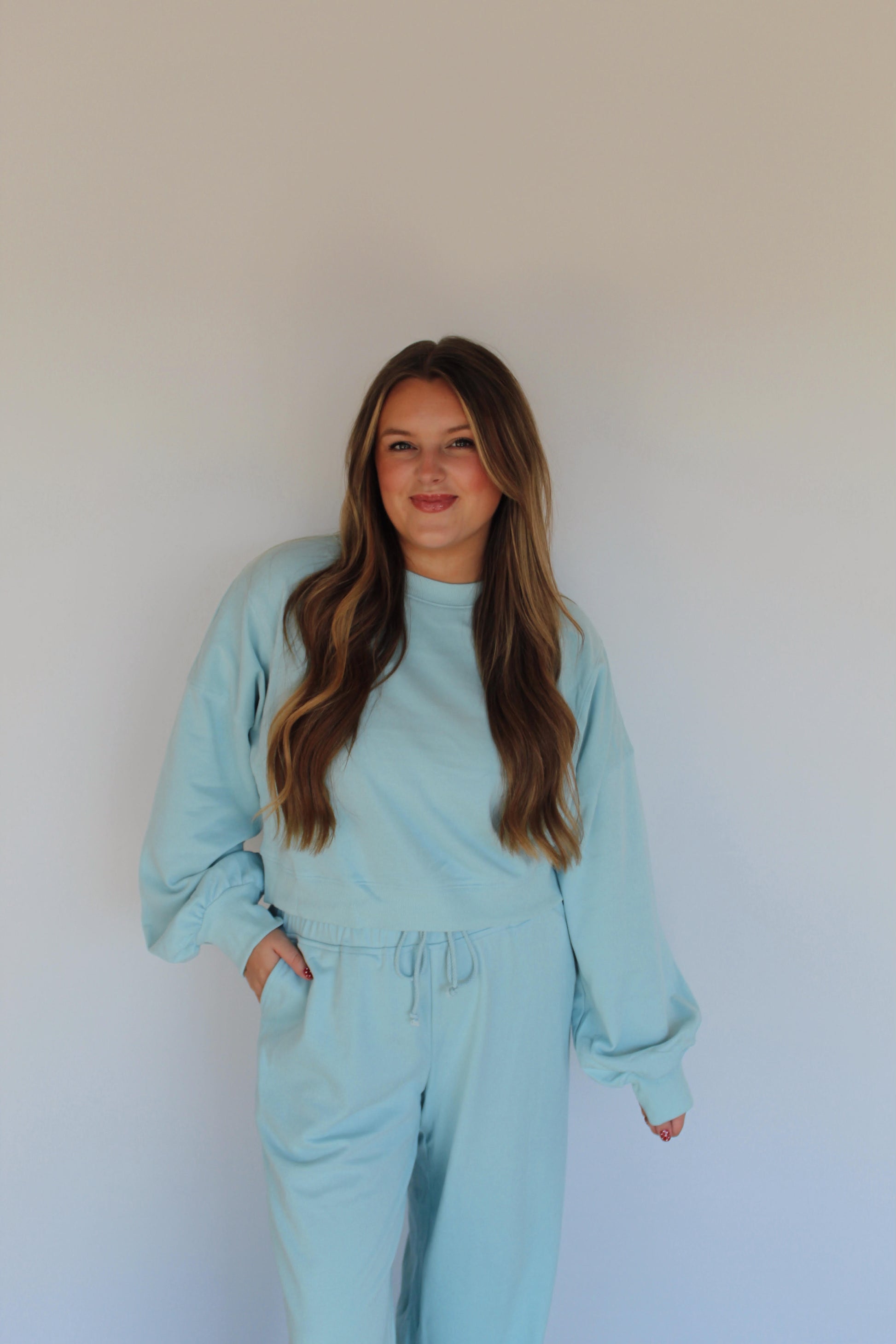 The Cloud Nine lounge set is your ultimate mix of cozy and chic. Made from the softest fleece-like material, this sky-blue matching set features a relaxed crewneck top with balloon sleeves and wide-leg drawstring pants for that effortlessly comfy vibe. Perfect for coffee runs, cozy nights in, or travel days when you still want to look put-together.