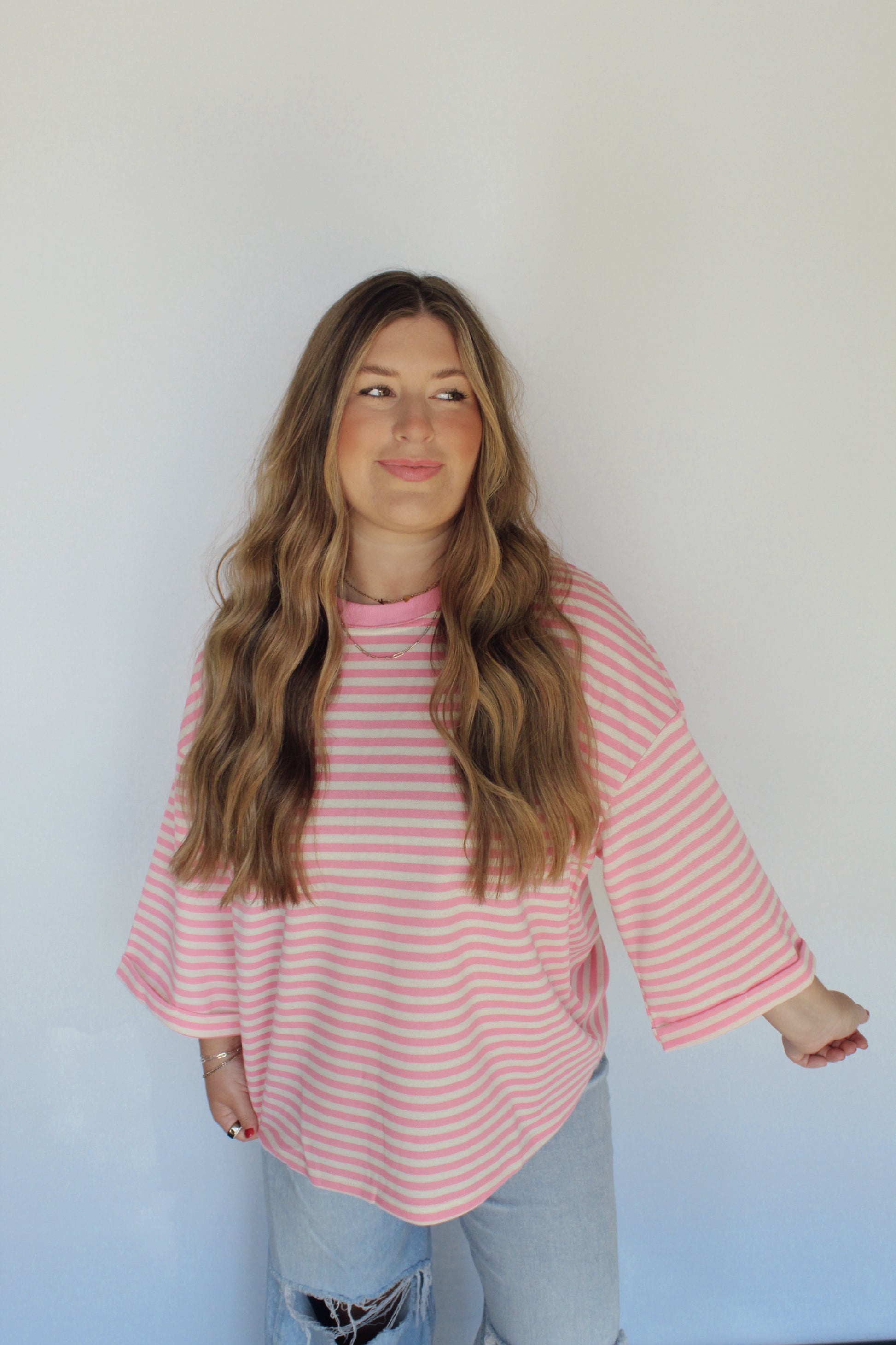 Playful, breezy, and just the right amount of flirty- this pink and white striped top is a must have for your closet. The relaxed fit and wide sleeves keep it casual and comfy, while the back tie detail with an open peek-a-boo cutout adds a fun, unexpected twist. It's the perfect piece to throw on with your favorite denim for a cute day-out look or even dressed up with accessories for brunch with the girls.